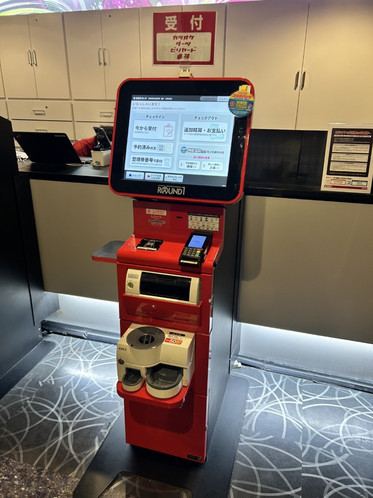 各階に設置されている受付精算機で、ボウリング・カラオケ・スポッチャなどのパックを選び入場します。