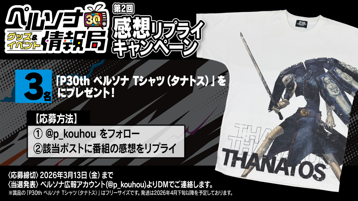 ②このポストに番組の感想をリプライ「ペルソナ30thグッズ&イベント情報局」