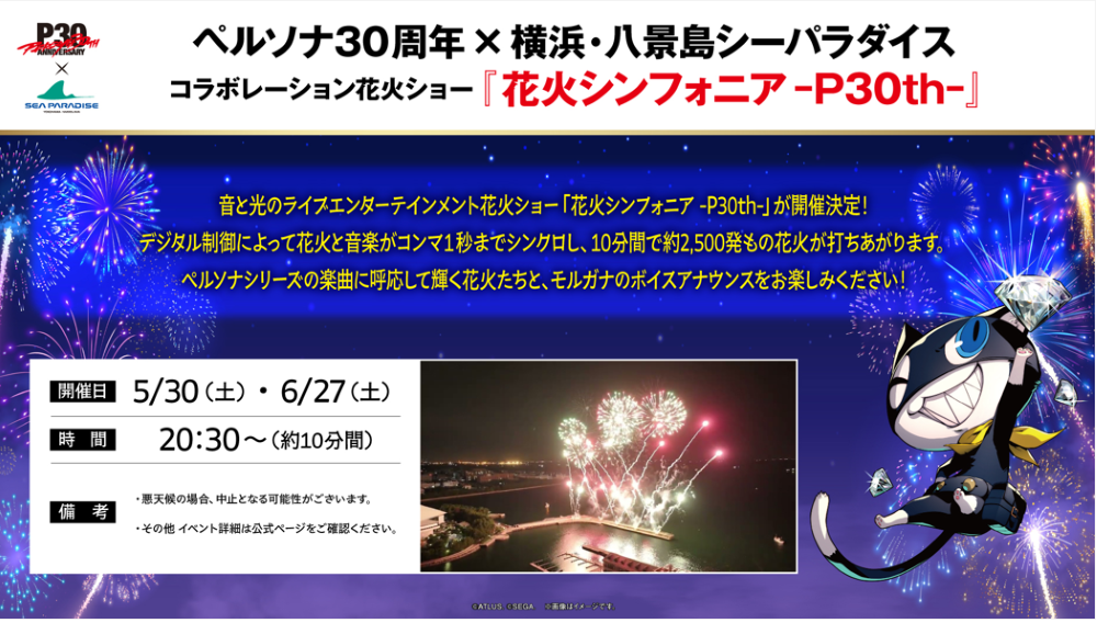 夜空を彩る花火にあわせて、モルガナのボイスアナウンスや『ペルソナ』シリーズ歴代楽曲をBGMとして使用した、30周年を祝う豪華な演出をご堪能いただけます。